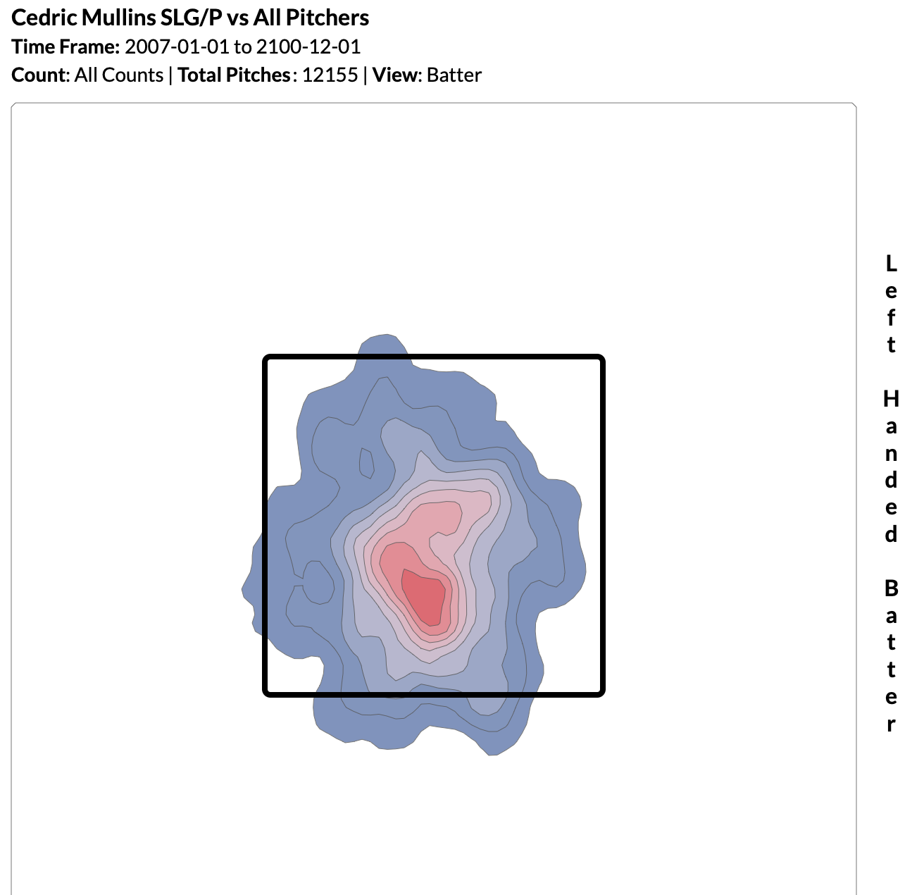 Not much indicating that he excels in hitting the high ones. Looks like he prefers the ball right down the middle, with some partiality to the middle-in pitch. I might come back to Altuve here once we start to recognize some patterns. For now, let’s move to the left side of the batters box and check out the career heat map showing SLG% by zone for Mets outfielder Cedric Mullins, another short king at five foot seven inches.
