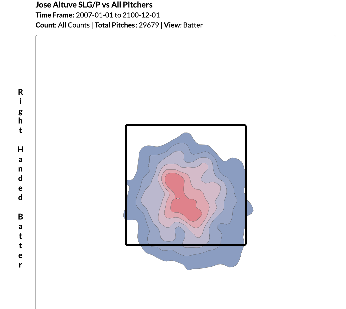 Let’s go back to Altuve. The heat map I showed for him may not be telling the whole story. That was just the SLG per pitch, which might not fully encapsulate what it means to be a good high ball hitter, which ultimately isn’t as black and white (or blue and red) as I made it seem.