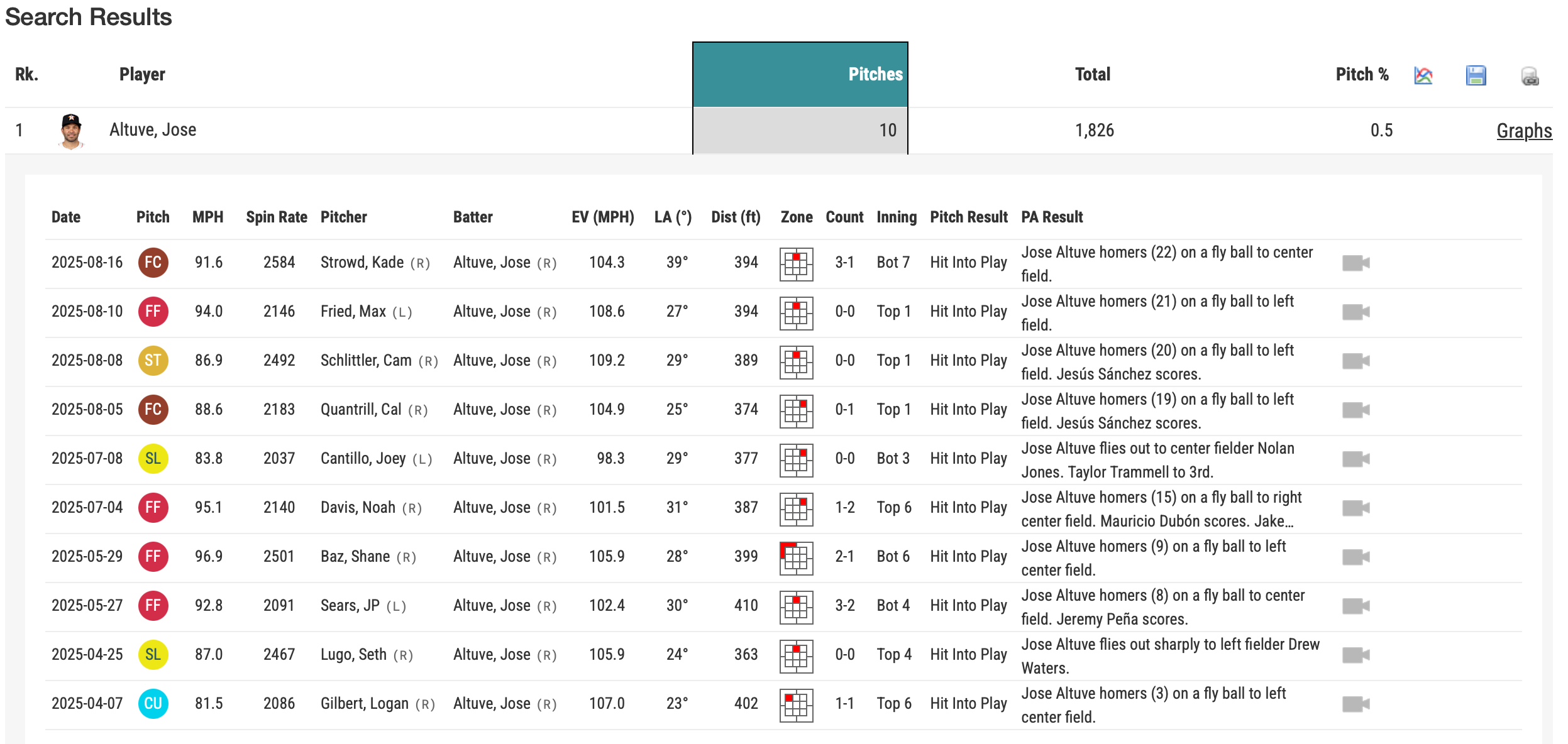 That’s the area I believe can be universally agreed upon as reasonably in range for “high ball” categorization. That being established, I searched for who has the most barrels in those locations. The leader? Jose Altuve.