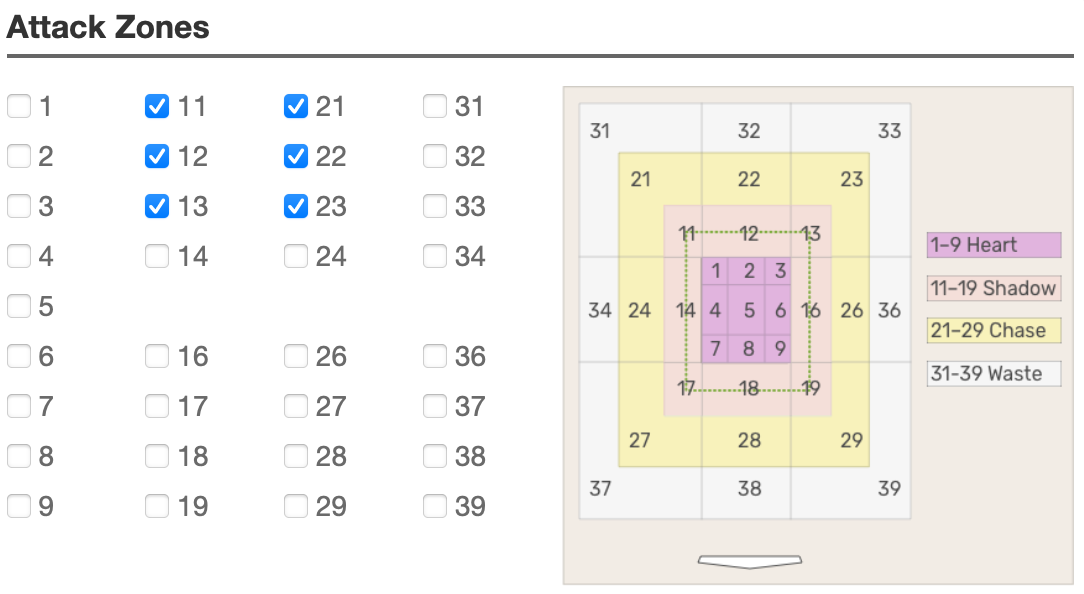What constitutes being a good high ball hitter? Is a good high ball hitter someone who fights off well located high balls for singles, or does damage up in the zone? In order to find out what a good high ball hitter looks like in the major league scope, I did a search for leaders in barrels in the upper third of the strike zone and the shadow area above it. The locations of the zones included can be seen here: