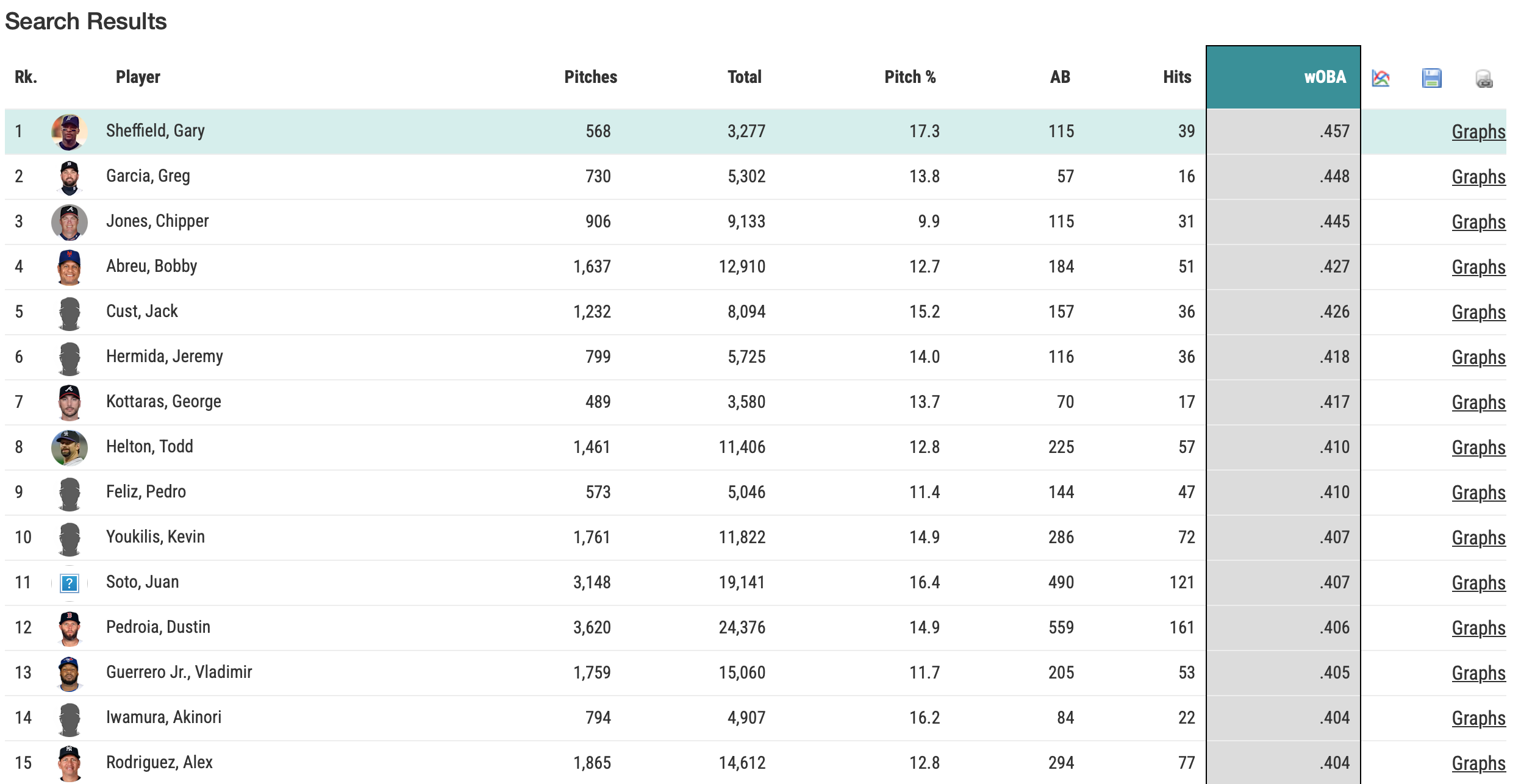There is one more way I’d like to test this theory though. The searches I did favored cumulative counting stats, which could be skewed in favor of hitters who have had more plate appearances or high balls thrown to them (ie more chances). I will search for wOBA now to see if anything changes. This list is ranked by wOBA on high pitches since 2008, with a minimum qualifying threshold of 100 plate appearances.